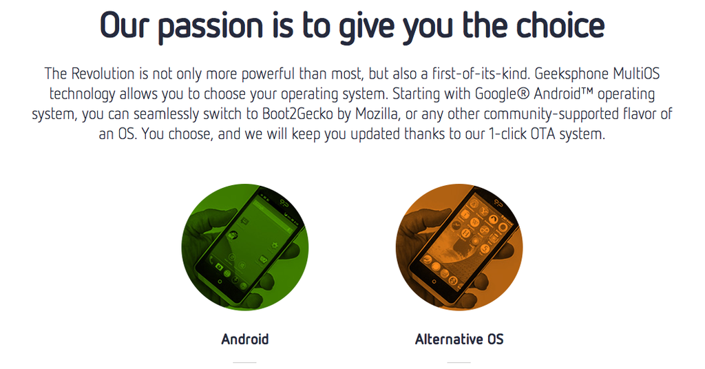 Pengeluar telefon pintar dari Sepanyol, Geeksphone melancarkan telefon mudah alih baru yang dinamakan Revolution yang membolehkan pengguna untuk beralih antara sistem operasi (operating system/OS) Android dan Firefox OS.